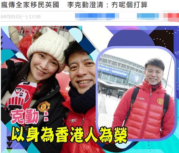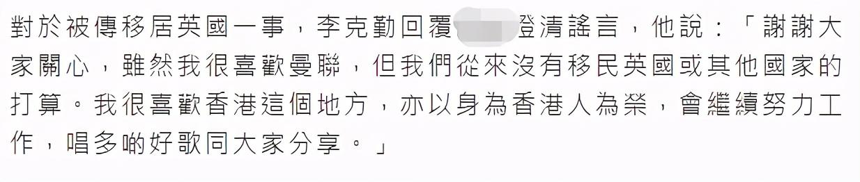 李克勤辟谣回复“谢谢大家关心,虽然我很喜欢曼联,但我们从来没有移民英国或其他国家的打算。我很喜欢香港这个地方,亦以身为香港人为荣,会继续努力工作,唱更多好歌同大家分享”。