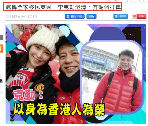 4月5日,据港媒报道,针对被传移民英国一事,李克勤回应称是谣言,他表示:“谢谢大家关心,虽然我很喜欢曼联,但是我们从来没有移民英国或者其他国家的打算。我很喜欢香港这个地方,亦以身为香港人为荣,会继续努力工作,唱多一点好歌给大家分享。”李克勤直接否认移民英国,并表达对家乡的喜爱,网友都表示很硬气。