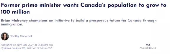 据《加拿大移民新闻》4月7日报道,加拿大前总理Brian Mulroney近日发出呼吁,为了未来的长久繁荣,加拿大需要在2100年把本国人口总数扩充到1亿人。