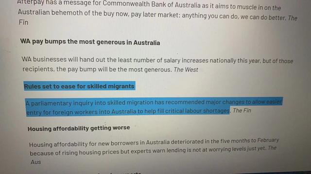 澳大利亚总理莫里森也在近日的讲话中表示,将推进移民改革,向人手短缺的领域倾斜。