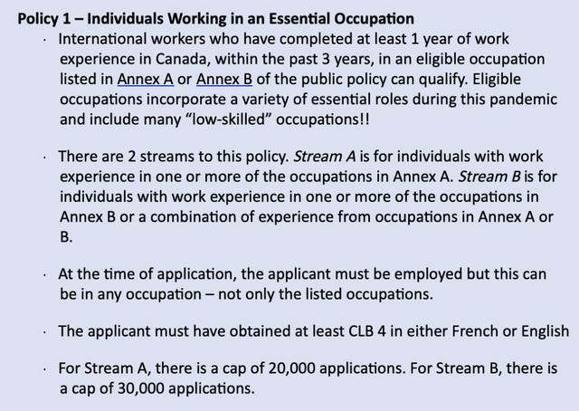 加拿大移民部长Marco Mendicino说,新政策将赋予拥有加国抗击流行病和实现经济复苏所需技能和经验的临时工和毕业生永久身份(枫叶PR卡)。但医疗保健和其他符合资格的必需工人必须具有至少一年的加拿大工作经验才能申请;这些类别不仅包括医生和护士,还包括家庭护理支持人员、家政和“其他医疗服务的辅助职业”。