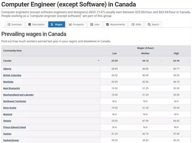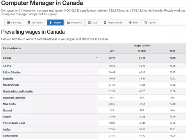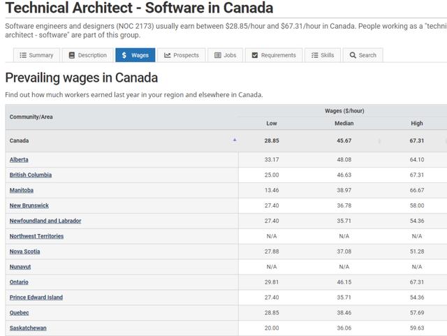 拿软件工程师为例,目前加拿大平均时薪中位数是$45.67,最低$28.85,最高$67.31,在其他省的具体时薪情况可见下图: