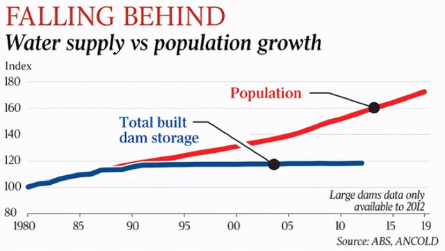 从下图可以看出,水资源的供应和移民人口的增长完全不相符,这让很多澳洲人非常担忧!