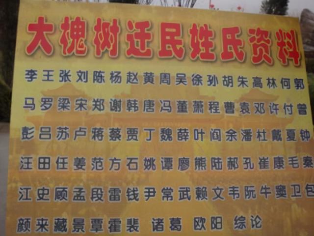 大槐树移民移走了上百万人,这些人姓812个不同的姓氏,基本上都是些类似赵钱孙李的常见姓氏,你们看看有没有自己的姓氏,他们都移到18个省,500多个县,有的老人想要孩子们永远记得自己的家,就指着大槐树说:“如果以后想不起自己的家在哪里了,就找到这棵大槐树,找到了大槐树就找到了自己的家!”黄河下游地区的人还编了一首歌谣记住自己的根:“若问老家在何处,山西洪洞大槐树。祖先故居叫什么,大槐树下老鸹窝。”