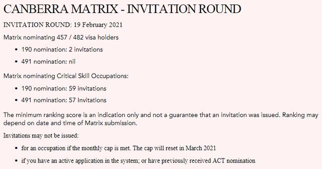 当地时间2月19日,澳洲堪培拉州担发放了新一轮州担保邀请,一般申请者发放了59个190和57个的491,其中,457/482工签持有人类别,2人获邀190。