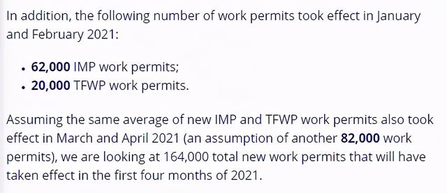 根据加拿大移民部统计,2021年第一季度期间就发放了12.4万个IMP和4万个TFWP。