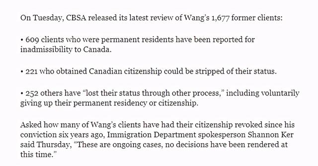 4月13日,加拿大边境服务局( CBSA)公布了对Xun Wang的1,677位前客户的最新审核,有609名已经拿到加拿大永居身份的申请者被取消身份,不被允许入境加拿大;另外221名已经成为加拿大公民身份的人可能会被剥夺身份;另外还有252名“通过其它程序失去了移民身份”,有些自愿放弃永居或公民身份的也包括在内。