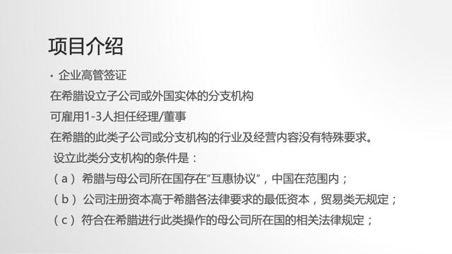 希腊企业高管签证,属于希腊D类签证,是颁发给外资企业在希腊的管理人员的签证。获得该签证的前提,是需要国内公司在希腊开设子公司或分支机构,并委派专人在希腊管理。而对于国内公司的营业情况,没有任何限制,任何现有的或者新创立的公司都可以通过该渠道在希腊开设公司并派驻管理人员。