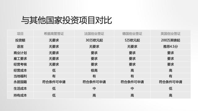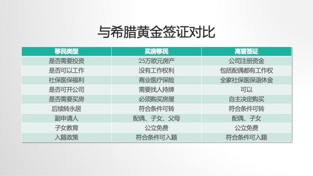 而对于决定移民希腊的朋友来说,在多了一种选择后也希望与“黄金签证”做一下对比,以下表格就是高管签证和“黄金签证”的对比。