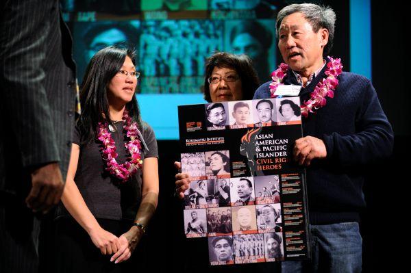 ▲图为2013年1月27日,旧金山举行纪念活动表彰17位(组)争取民权的亚裔英雄,其中包括4名华裔。图为黄诺曼(右)与家人代替祖父黄金德领奖。(图片来自中新社)