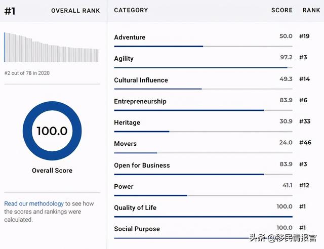 在最佳国家排名中,加拿大一直名列前茅。2020年加拿大排名第二,2019年排名第三,今年加拿大更是以满分问鼎全球最佳国家,首次名列第一!