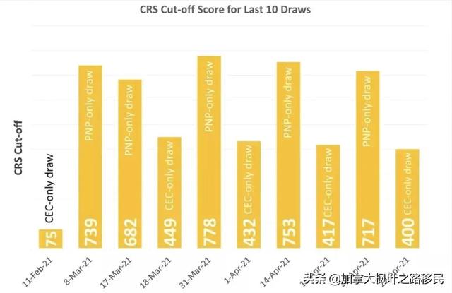自从2月11号的EE大赦以来,CEC的分数线一降再降,从3月18号的449分到今天的400分,两个月内下降了将近50分,预计下一次的EE邀请分数线有可能会跌破400分。