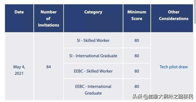 5月4日,BC省移民部发出新一轮省提名邀请,共有84位从事高新科技行业的申请人获得邀请。获邀候选人的最低分数为80分,与上一轮此类别抽签分数持平。