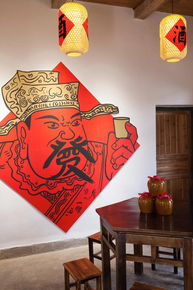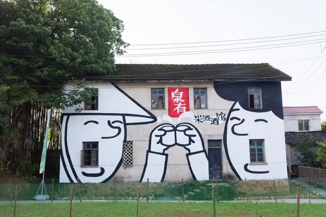 插画家TANGO将村民王泉有的屋子改造成了《泉有米酒酒馆》。王泉有传承了祖籍浙江淳安的酿酒工艺,他从2002年开始做酒,按照浙江祖传工艺,在花雕配方中加入花椒,制作20度左右的糯米酒。据了解,60%-70%的千岛湖移民都会做酒,但目前只有王泉有家还在运营中,泉有米酒在当地名气不小。TANGO告诉记者,在发现屋主有酿酒生意后,他立刻想到了开酒馆的主意。在两层楼高的房屋外墙上,他绘制了两个举杯痛饮的人——这是两个标准的农民形象,窗户是两人开怀大笑的嘴。屋内摆放了小酒馆桌椅,配以从浙江带来的竹灯,墙上悬挂了TANGO过往漫画中描述饮酒场景的作品。胡子和嘴巧妙地构成“发”字的财神爷也举着酒杯,邀请到访者来上一杯。