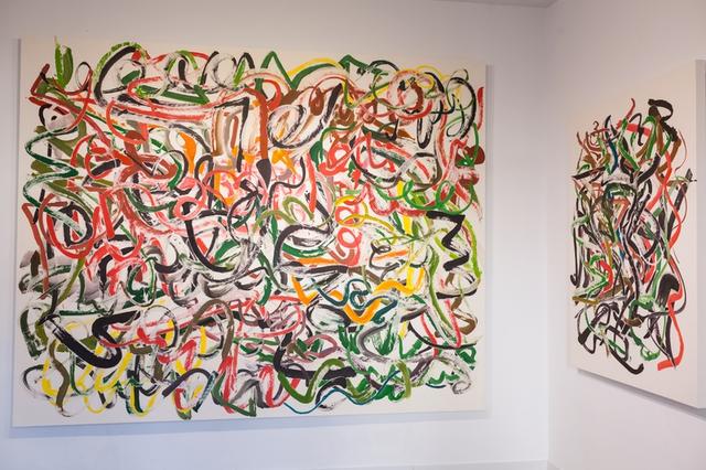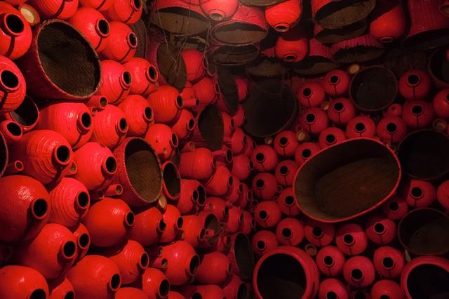 邬建安延续了他从2016年纽约大都会艺术博物馆公共艺术项目《解放美猴王》开始的水墨拼贴实践。在《五百笔@浮梁》中,他邀请当地居民随心所欲地用毛笔在宣纸上画出一笔,再将这些笔画剪下来,拼贴成一幅形似杰克逊·波洛克抽象表现主义绘画的水墨拼贴画。在艺术家看来,每一笔都凝聚着一个人当时当地的心境,它们象征着浮梁一个个鲜活的生命。同屋的另一间房间里展示的是邬建安的装置作品《记忆的容器》:他从寒溪村居民的家中收集了各式各样的容器——水罐、脸盆、米缸——统一上色,安装在房间的四壁和天花板上,形成一个亮粉色的空间。这些容器曾在村民的生活中发挥重要作用,而今它们被褪去了原始功能,却在无声地述说主人们的故事。