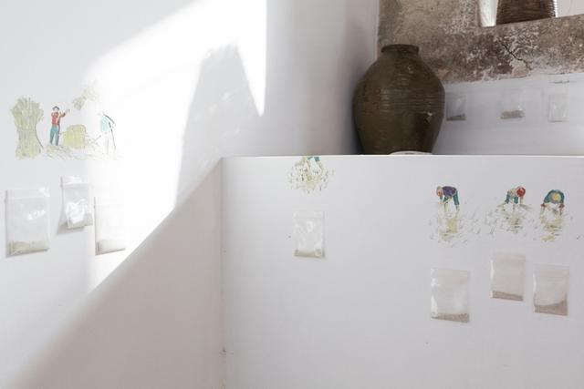 艺术家向阳在茶园尽头两间废弃的临水屋子里驻扎创作《进化中的尘埃》。他用16种不同颜色的漆一遍遍刷墙,然后刻出当地的种种生活图景——陶瓷制作、村落移民和建设的历史、村民的生活点滴、灶头上晾晒的腊肉、村头闲逛的鸡鸭……刻墙时散落的碎屑与漆皮被收集在每个人物形象下面的透明的小袋子里。有意思的是,艺术家将创作过程也刻了下来,在对着屋外另外一件作品《半野花园》的窗户旁,他刻下了艺术家造园时种树的场景;房间里的另外一个角落,艺术家本人正在和前来视察的村领导和项目负责人交流。在向阳看来,“艺术在浮梁”和因为这个项目来到这里的艺术家也构成了当地历史的一部分,融入了村子的记忆之中。