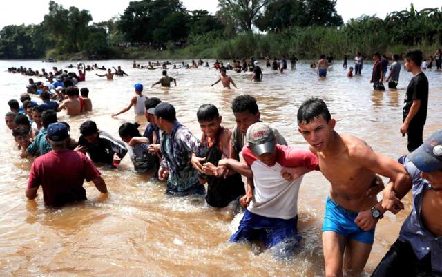 大量非法移民穿过美墨边境的河流,进入美国境内
