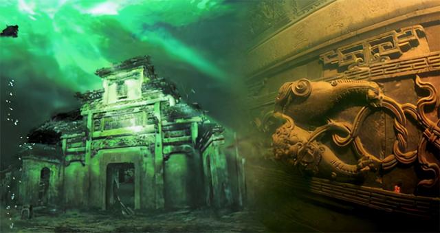 沉睡在幽暗的湖底,几条鱼儿从牌坊顶上游过,桑田沧海,湖面之上新安江水库开闸泄洪。