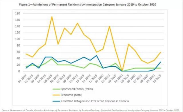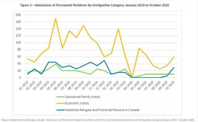 加拿大在2019年1月到2020年10月之间的PR签发数量曲线图。