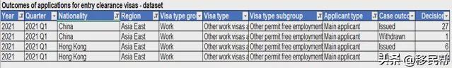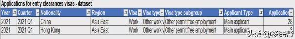 这个Other permit free employment类别的签证申请和过签情况是中国大陆申请人递交了28份,获批了27份,签证通过率为96%;中国香港递交了8份,获批了6份,签证通过率为75%。因此,2021年第一季度递交总量为36份,获批了33份,签证通过率为92%。