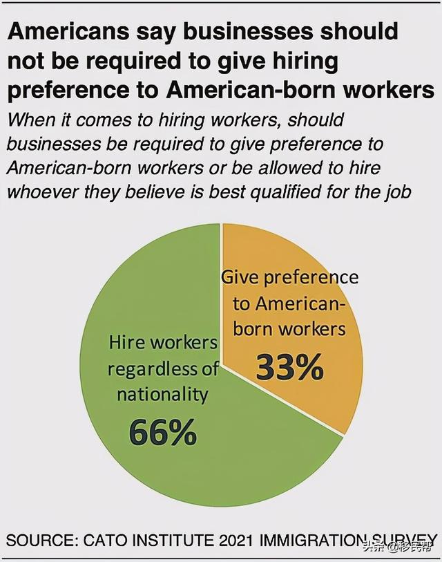 三分之二的美国人(66%)说,企业应该被允许雇用他们认为最适合该职位的人,不论其国籍如何。三分之一(33%)的人则认为应该要求企业“优先考虑美国出生的工人”。