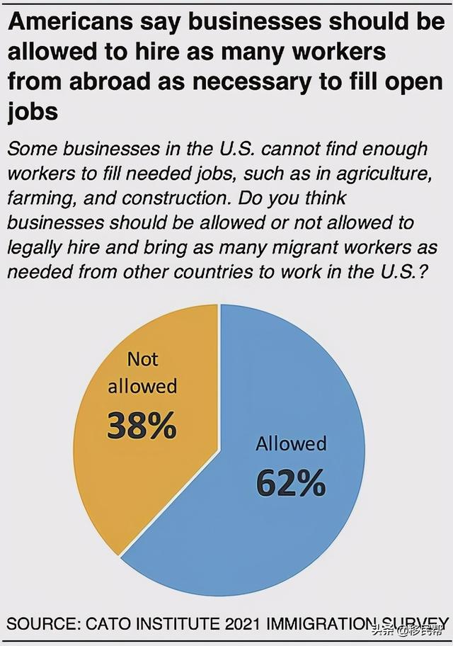 接近三分之二(62%)的美国人说,当企业找不到足够的工人来填补农业,农业和建筑等所需的工作时,应允许他们从其他地方雇佣尽可能多的移民工人,38%反对。