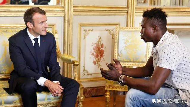 ▲ 马克龙2018年5月28日在爱丽舍宫接见马里籍难民贾萨马(Mamoudou Gassama),后者5月26日曾徒手攀上巴黎18区一栋居民楼,救下一名有坠楼危险的儿童,同年9月13日,贾萨马加入法国国籍,法国前总理菲利普称”贾萨马的伟大举动是对诸如勇气、无私、利他等有助于将国家团结为一体精神的榜样般诠释“。