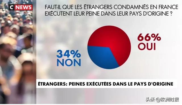 ▲ 法国媒体CNEWS 6月3日公布的一项调查显示:1000名受访者中,64%的受访者认为在法国因犯罪和违法被判刑的外国人必须回到原籍国服刑。