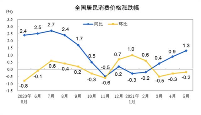 | 图/ 2021年5月份居民消费价格同比上涨1.3%,环比下降0.2%(国家统计局)