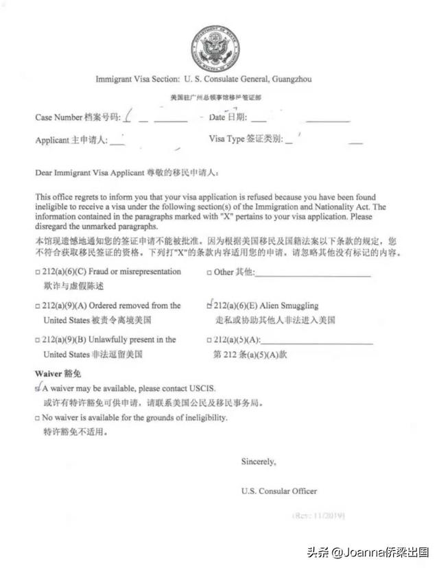 以下是面谈后拒签但有机会做豁免的通知单样板。这位客人是IR5类别的移民(美国公民申请父母),面谈后被拒签,但是有资格做豁免。拒签后找到侨梁团队,委托侨梁处理其豁免案子。侨梁团队收集多方证据、资料、写声明信、翻译,完整向移民局递交了I-601豁免申请,6个月后一次性获得了移民局批准。在侨梁团队的处理下,最后顺利获得签证,与家人团聚!