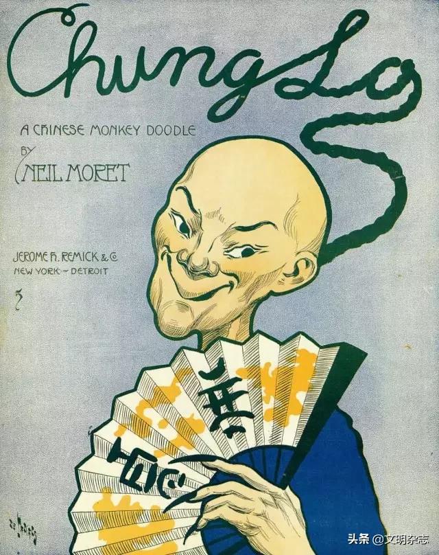 △十九世纪的乐谱。封面画中的华人露出奸邪的笑容,手指甲又黑又尖锐,十足的鬼怪形象。这首乐曲名为《中国呆子》,节奏轻松且略带俏皮,似乎在描述一个低阶的华工在美国社会四处出洋相后却又一副愣头愣脑、逆来顺受的表情。艺术作品是一种媒介,可以反映出当时社会对华人的共同印象,以及丑化华人的事实。
