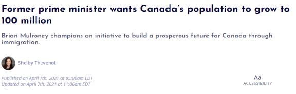 加拿大前总理Brian Mulroney曾发出呼吁,为了未来的长久繁荣,加拿大需要在2100年把本国人口总数扩充到1亿人。