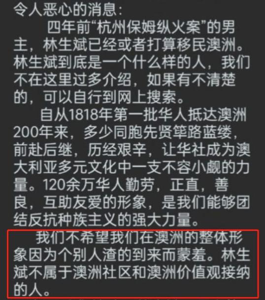 尤其是澳洲当地的华侨,他们听说林生斌有可能移民澳洲之后,还写了一篇很长的抵制声明,声称他们不希望他们在澳洲的整体形象,因为个别人渣的到来而蒙羞。