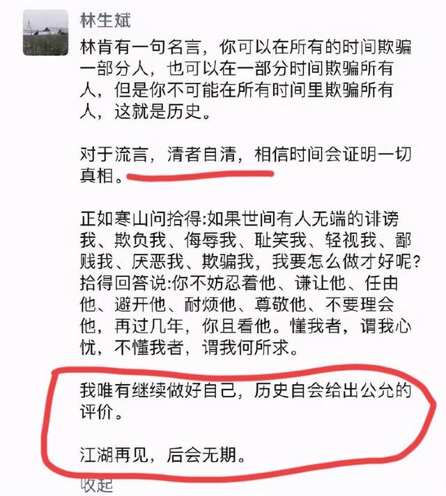 他深情人设崩塌一事,持续在网络上发酵,可林生斌本人却一直没公开回应过,但有知情人士PO出过林生斌朋友圈的截图,林生斌发的这条朋友圈,依旧坚持“清者自清”,他为自己辩驳是在意料之中的事情,可结尾处的“江湖再见,后会无期”却让人有些摸不到头脑。