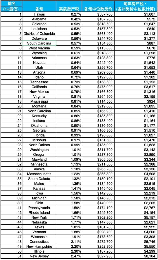为了对美国各州房产税进行排名,研究人员利用美国人口普查局的数据对全美50个州和哥伦比亚特区进行了比较,以确定房地产税率。