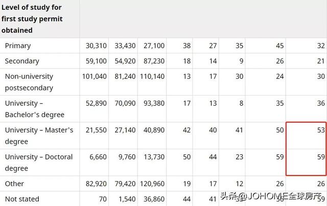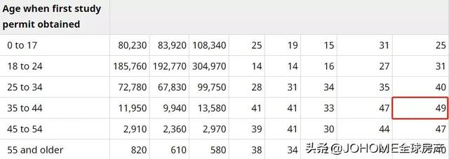 在35-44岁首次获批学签的留学生中,有49%成功在来到加拿大的十年中拿到PR身份。