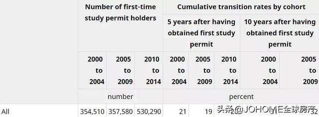 在2005-2009年首次通过申请中学来加拿大读书的留学生中,仅有21%成功在10年内拿到PR身份。