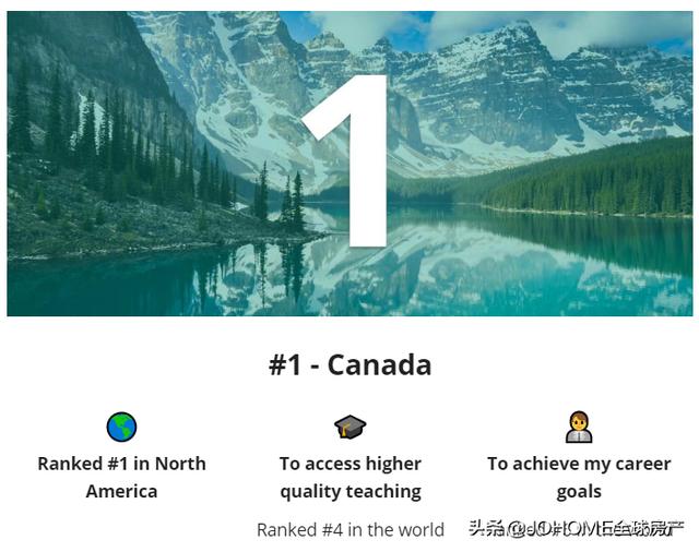 在这些维度中,加拿大“教学质量”这一栏排名世界第4、“实现自我职业价值”排名世界第6,虽然没有特别高的分项,但胜在实力均衡!