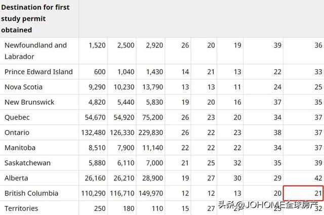 而那些首次申请学签是在BC省读书的留学生在十年内拿到PR的比例最低,为21%!