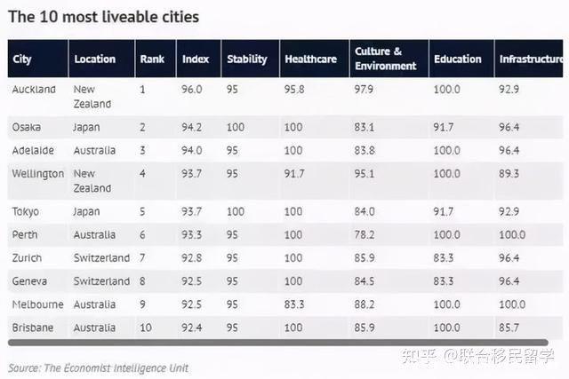 美国经济学人智库发布的2021年“最宜居城市”排行榜中上榜的前十名国家有澳洲、日本、新西兰、瑞士,该排名是综合评估了城市稳定性、文化与环境、医疗健康、教育和基础设施建设这五个方面,这些城市正在成为新移民的移民目的地。