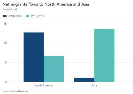 ▲北美和亚洲净移民流入人数对比。亚洲国家在21世纪吸引了1670万移民,2010年到2017年间1370万,而20世纪90年代移民流入亚洲的人数才刚过100万。