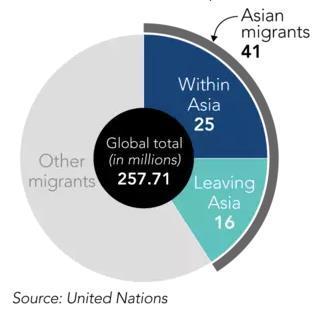▲全球四分之一的移民属于亚洲人移居亚洲。