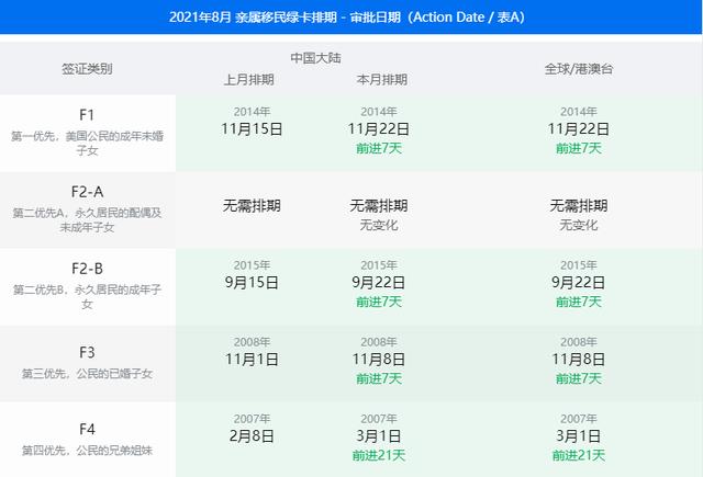 至于绿卡持有者已经成年的子女,也就是F2-B类移民前进了7天,目前排到2015年9月22日,它的排期是比F1还近的,也就是说:如果申请者的父母拿的是绿卡,他可能更快获得绿卡,而如果申请者的父母已经入籍成公民,拿绿卡速度会更慢。