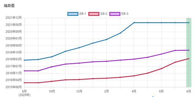 EB-2在这几个月都有比较大幅度的前进,相信这是美国为吸引人才而加快职业移民的步伐。