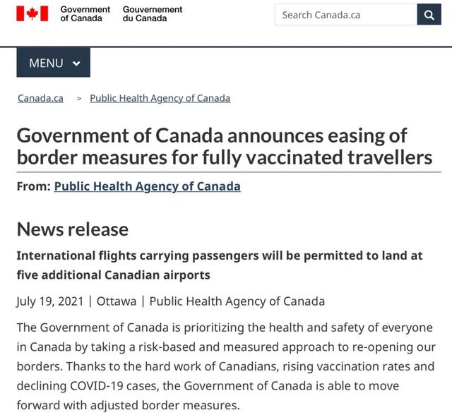 如果疫情得到控制,加拿大将从8月9日开始接受来自美国的美国公民和永久居民。同一天,加拿大还将对所有旅客解除酒店隔离。9月7日,边境将对所有国家接种过疫苗的旅客重新开放。完全接种疫苗的旅行者不再需要在抵达时和第8天进行检测,但他们可能在边境接受随机检测。为了被认为是“完全接种疫苗”,旅行者必须拥有在加拿大批准使用的疫苗的推荐剂量。最后一次注射必须在进入前至少14天申报。这与旅行者接种疫苗的国家无关。目前,加拿大接受了以下疫苗生产商:阿斯特拉捷利康、辉瑞、Moderna和詹森(强生)。所有的成绩必须用法语或英语原件或公证翻译件提交。在来加拿大之前,所有文件需要提交到ArriveCan app或网站。所有旅客仍然需要一个14天的隔离计划。新措施要到多伦多时间8月9日12点01分才开始生效。政府官员还证实,加拿大将延长直飞印度的禁令。