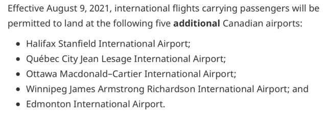 同样从8月9日开始,还有5个机场将再次接受国际航班。哈利法克斯、魁北克市、渥太华、温尼伯和埃德蒙顿的机场现在将对国际航班入境开放。乘客仍需遵守公共卫生准则。在疫情期间,接受国际入境的机场只有温哥华、卡尔加里、多伦多和蒙特利尔。