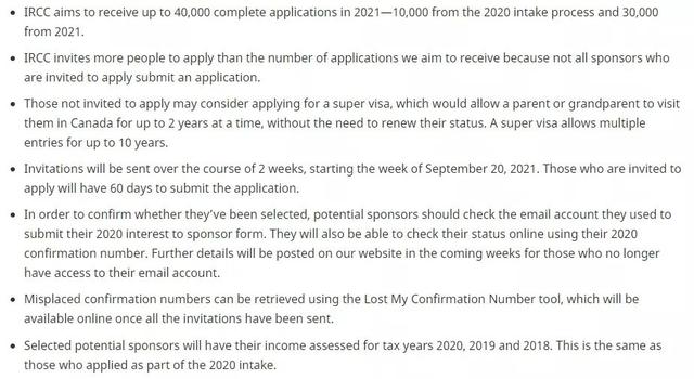 在最新公布的年度配额加中,预计今年将拥有30000个担保配额,并采取与往年相同的随机抽签方式,同时IRCC也表示,将在已经在2020年提交意向表的担保人中进行抽签,发送邀请,不再接受新的意向申请入池,新担保人只能等2022年的名额了,申请邀请将从2021 年 9 月 20 日那一周开始发放,预计持续2周。