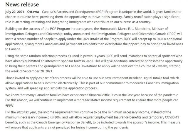 2021 年 7 月 20 日下午5点(多伦多时间),移民部长Marco Mendicin召开会议并发布了关于2021年父母团聚移民(PGP)申请细则。