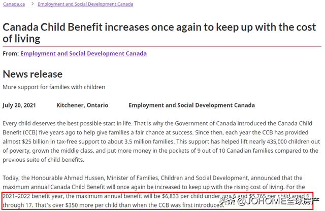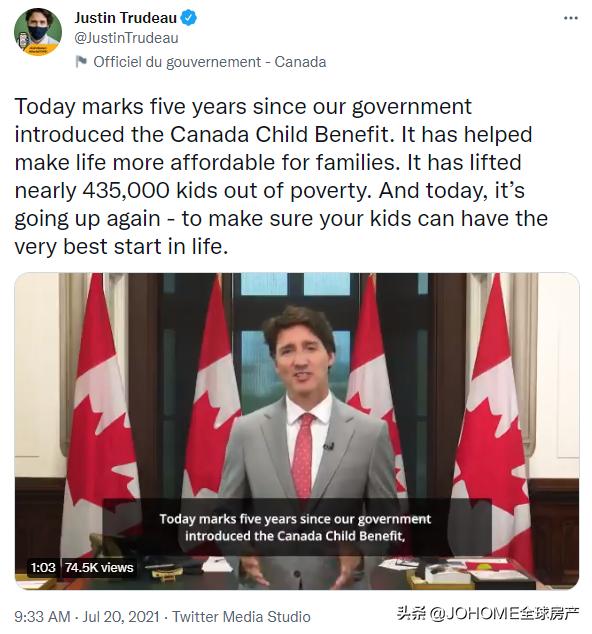 而在同一天,特鲁多在推特上宣布,加拿大今日再次增加牛奶金(Canada Child Benefit),以确保孩子们拥有一个最好开始的生活。