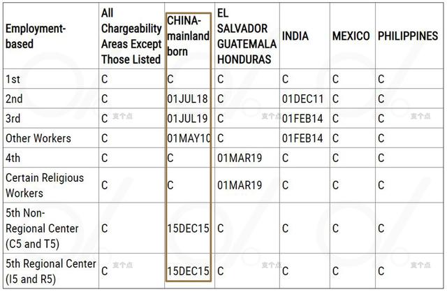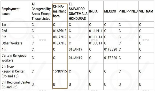 中国大陆地区亲属移民绿卡排期情况,A表各类别前进速度放缓,B表没有任何变化,继续开放: